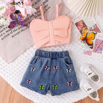 ใหม่ชุดสูทเด็กผู้หญิงสไตล์ยุโรปและอเมริกาสำหรับฤดูร้อนเสื้อสายเอี๊ยม + กางเกงขาสั้นพิมพ์ลาย